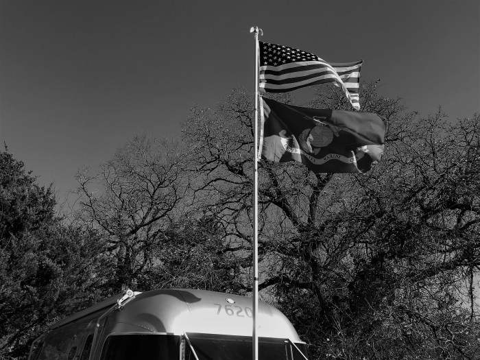 We fly the U.S. flag along with the Marine Corps flag to signal our love of country and to honor Cliff’s military service. Some Airstreamers have elaborate set-ups, with from three to five flags presented in a spoke configuration on a pole bracket. For a few years, we had a smaller display of three flags that we adhered to our front window with a suction cup. But we always longed for something more substantial.