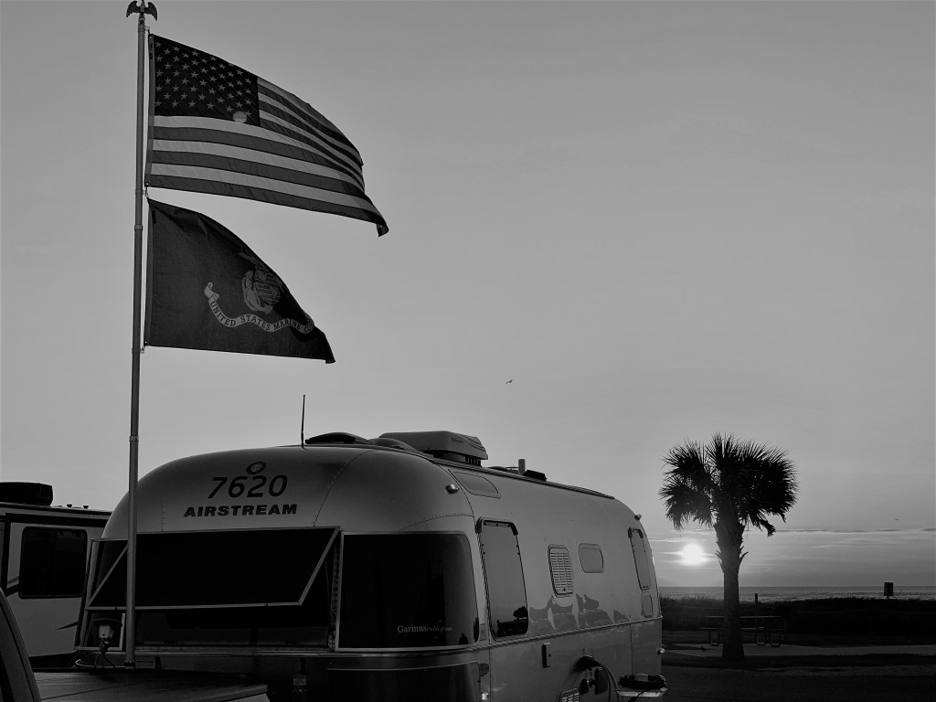 Nearly 50 years later, we pulled Cloud 9 across that same causeway under overcast skies and breezy conditions. After setting up, we walked to a nearby convenience store to pick up a few items we forgot to pack and returned just in time to watch the network news while enjoying cocktails and hors d’oeuvres. Chef Cliff’s dinner consisted of lightly seasoned pork chops, cob corn, shishito peppers, and asparagus, all grilled to perfection. Later in the evening, we settled in to watch Eddie Murphy’s triumphant return to host Saturday Night Live after a 35-year absence. We had no regrets about opting for SNL over a long late-night walk along the wind-swept beach.