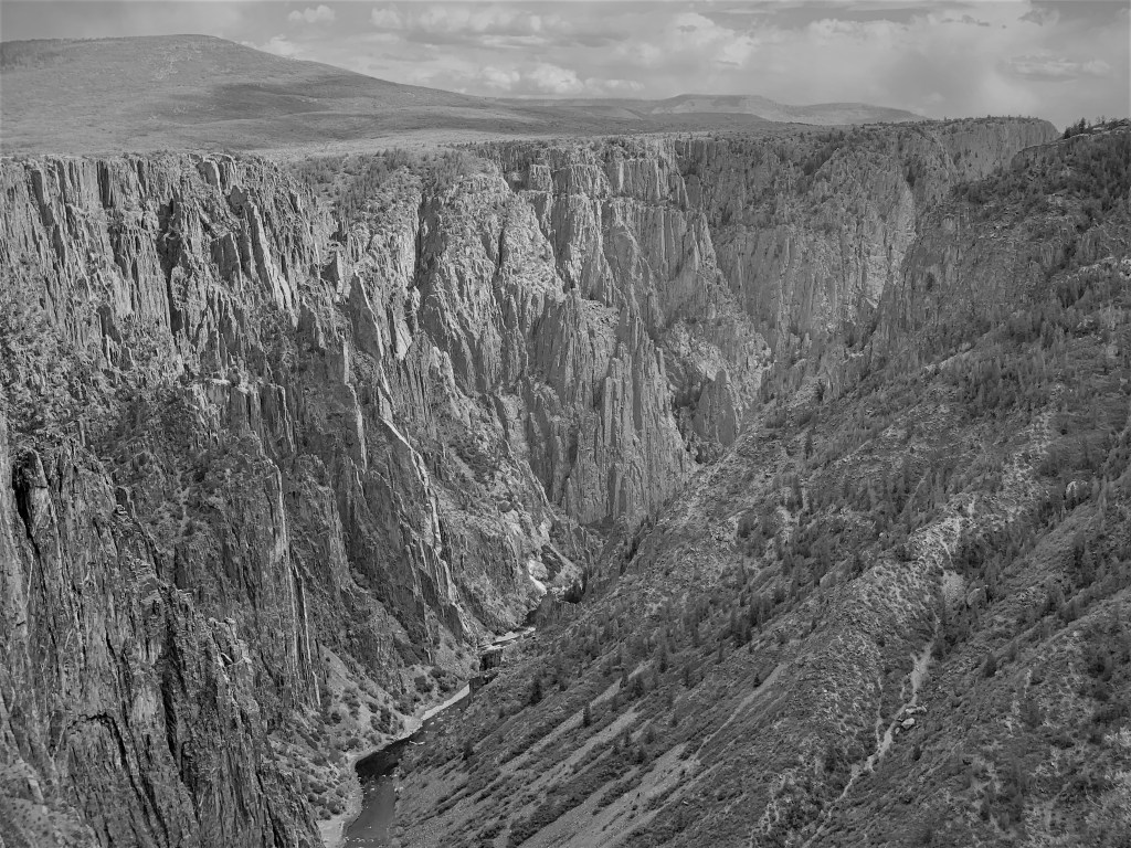 Another spectacular feature of the canyon is the pinkish pegmatite dikes that form bands across Painted Wall, the tallest sheer cliff in Colorado. For millions of years the Gunnison river has been eroding the deep, narrow gorge through the precambrian rocks of the Gunnison Uplift, a dome of mostly dark metamorphic gneisses and schist. The pegmatite veins were originally molten rock, or magma, which squeezed, or intruded, into fissures withing the already-hardened gneisses and schist deep within the earth. In some places the pegmatite, a granite more resistant to erosion than the surrounding rock, shows up in vertical fins; in others it manifests as serpentine bands that pattern the darker rock, as on the Painted Wall.