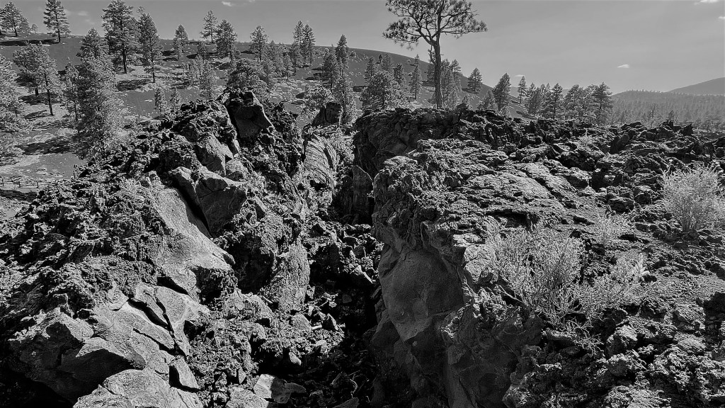Cinder cones are formed when magma (molten rock and highly-compressed gases) sprays high into the air from a central vent in the ground, solidifies, then falls to Earth as large bombs or smaller cinders. As cinders erupted from Sunset Crater, they blanketed older volcanos, creating cinder dunes. The lightest, smallest particles were carried farthest by the wind, covering nearly 800 square miles of Arizona with ash. Perhaps as spectacular as the original eruption were two lava flows: the Kana-a and the Bonito. They destroyed all living things in their path, and left behind a strangely beautiful volcanic landscape.