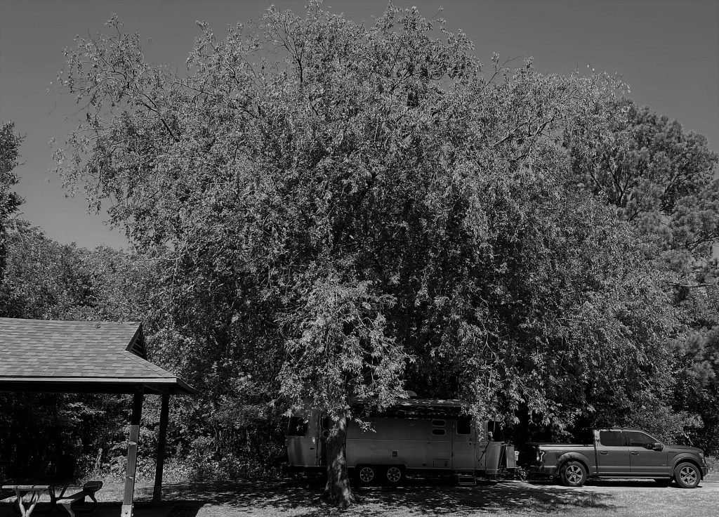 Next morning around 7:00, with temperatures in the mid-80s, we decided to take a walk along the camping loop. Aside from taking the dogs out, that 30-minute walk was our only real activity of the day. We settled in to read The New York Times, enjoy breakfast cocktails, and prepare for brunch. After a long afternoon nap, we enjoyed cocktails, conversation with Jon’s mom, and a marvelous Saturday supper of grilled pork chops, cob corn, and broccoli while watching the Grand Old Opry tribute to Merle Haggard.