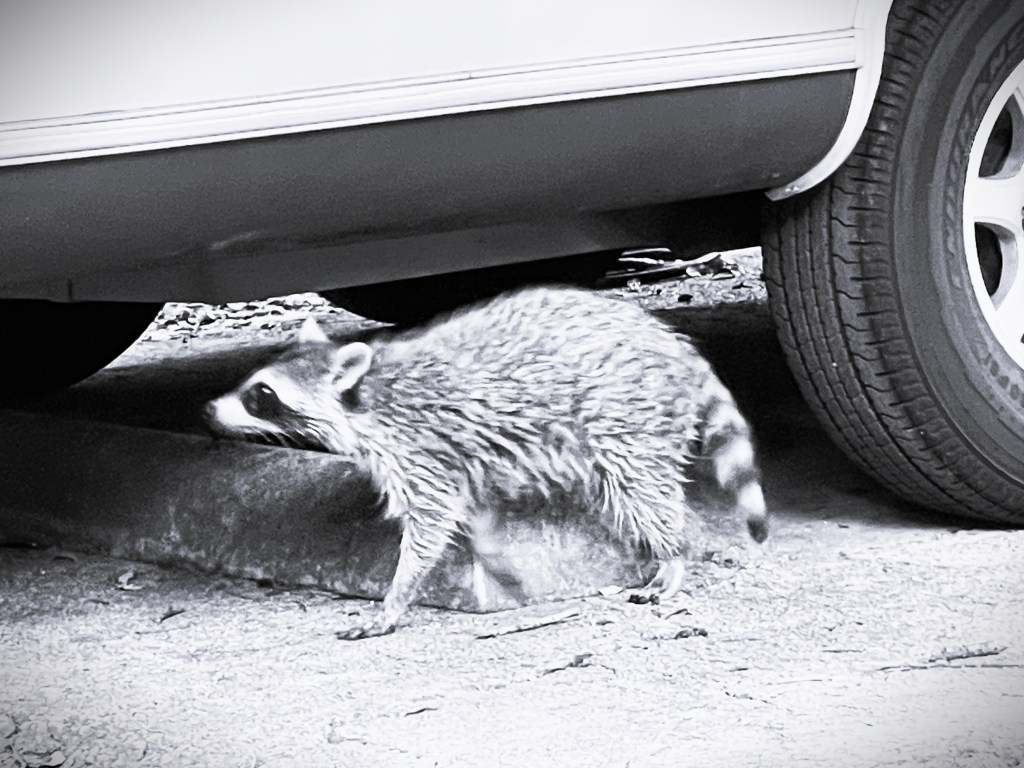 Saturday found us enjoying a mild morning under the pavilion, watching “CBS Saturday Morning,” reading The New York Times, televisiting Jon’s mom, and enjoying breakfast cocktails and brunch. A luxurious two-hour afternoon nap preceded a proper cocktail hour, this time with limoncello and vodka, in addition to grilled shrimp with St. Elmo’s cocktail sauce. Moving outside, we were greeted by a friendly raccoon that boldly approached us for food. Not wanting to make a new pet, we dispatched him to the next campsite, where he was promptly confronted by the family dog.